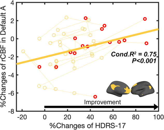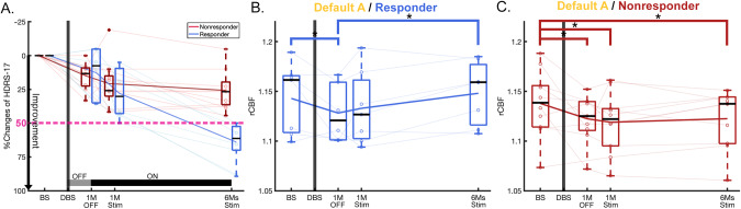 Ongoing experimental studies of subcallosal cingulate deep brain stimulation (SCC DBS) for treatment-resistant depression (TRD) show a differential timeline of behavioral effects with rapid changes after initial stimulation, and both early and delayed changes over the course of ongoing chronic stimulation. This study examined the longitudinal resting-state regional cerebral blood flow (rCBF) changes in intrinsic connectivity networks (ICNs) with SCC DBS for TRD over 6 months and repeated the same analysis by glucose metabolite changes in a new cohort. A total of twenty-two patients with TRD, 17 [15 O]-water and 5 [18 F]-fluorodeoxyglucose (FDG) positron emission tomography (PET) patients, received SCC DBS and were followed weekly for 7 months. PET scans were collected at 4-time points: baseline, 1-month after surgery, and 1 and 6 months of chronic stimulation. A linear mixed model was conducted to examine the differential trajectory of rCBF changes over time. Post-hoc tests were also examined to assess postoperative, early, and late ICN changes and response-specific effects. SCC DBS had significant time-specific effects in the salience network (SN) and the default mode network (DMN). The rCBF in SN and DMN was decreased after surgery, but responder and non-responders diverged thereafter, with a net increase in DMN activity in responders with chronic stimulation. Additionally, the rCBF in the DMN uniquely correlated with depression severity. The glucose metabolic changes in a second cohort show the same DMN changes. The trajectory of PET changes with SCC DBS is not linear, consistent with the chronology of therapeutic effects. These data provide novel evidence of both an acute reset and ongoing plastic effects in the DMN that may provide future biomarkers to track clinical improvement with ongoing treatment.