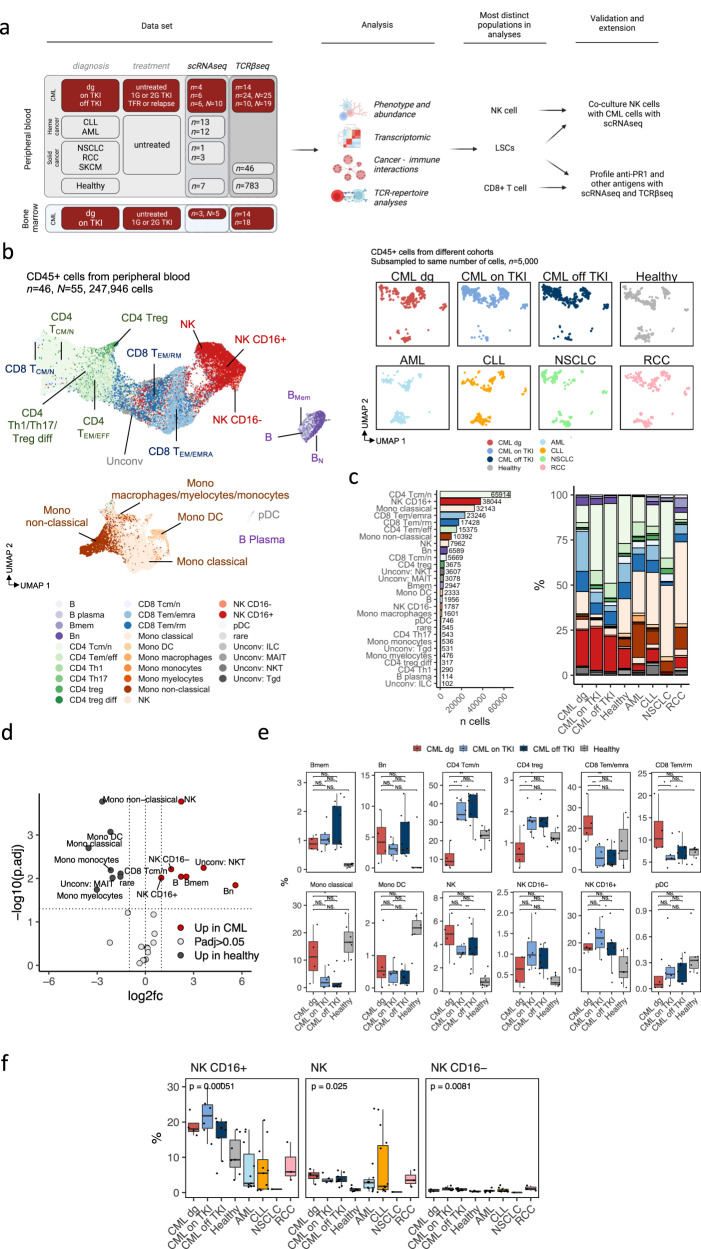 Immunological control of residual leukemia cells is thought to occur in patients with chronic myeloid leukemia (CML) that maintain treatment-free remission (TFR) following tyrosine kinase inhibitor (TKI) discontinuation. To study this, we analyzed 55 single-cell RNA and T cell receptor (TCR) sequenced samples (scRNA+TCRαβ-seq) from patients with CML (n = 13, N = 25), other cancers (n = 28), and healthy (n = 7). The high number and active phenotype of natural killer (NK) cells in CML separated them from healthy and other cancers. Most NK cells in CML belonged to the active CD56dim cluster with high expression of GZMA/B, PRF1, CCL3/4, and IFNG, with interactions with leukemic cells via inhibitory LGALS9-TIM3 and PVR-TIGIT interactions. Accordingly, upregulation of LGALS9 was observed in CML target cells and TIM3 in NK cells when co-cultured together. Additionally, we created a classifier to identify TCRs targeting leukemia-associated antigen PR1 and quantified anti-PR1 T cells in 90 CML and 786 healthy TCRβ-sequenced samples. Anti-PR1 T cells were more prevalent in CML, enriched in bone marrow samples, and enriched in the mature, cytotoxic CD8 + TEMRA cluster, especially in a patient maintaining TFR. Our results highlight the role of NK cells and anti-PR1 T cells in anti-leukemic immune responses in CML.