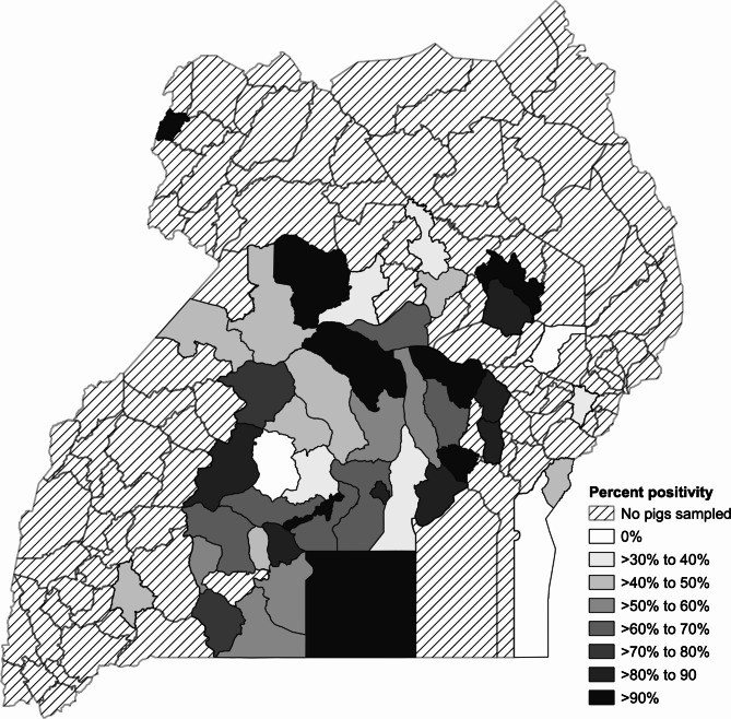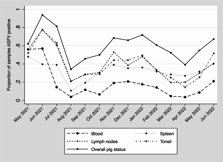Results: Only 0.15% of pigs had detectable antibodies against ASFV, suggesting low survival rates or pre-clinical diagnosis. Yet, 59.5% of pigs were positive for ASFV DNA. Blood had the lowest detection rate (15.3%) while tonsil and lymph nodes had the highest (38% and 37.5%, respectively), spleen samples (31.5%) were in between. Agreement between sample types was fair to moderate overall. A significant seasonality of ASFV infections emerged with infections found predominately in the dry seasons. Spatial assessments revealed that the greater Kampala metropolitan area abattoirs have a catchment area that overlaps with Uganda's most pig dense regions.