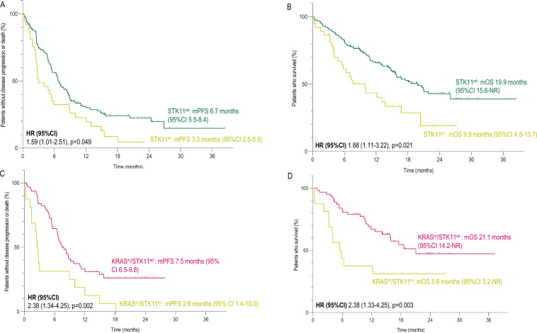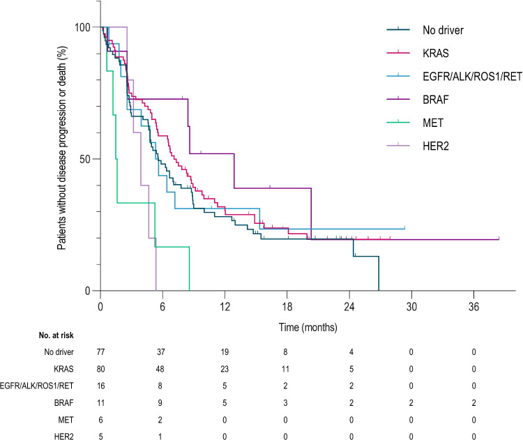 Results: Among the 195 patients included between September 2018 and October 2021, 88 (41%) had a KRAS mutation, 16 (8.2%) an EGFR mutation or an ALK, ROS1, or RET rearrangement, 11 (5.6%) a BRAF mutation, 6 (3.1%) a MET exon 14 mutation or MET amplification, and 5 (2.6%) a HER2 mutation. Seventy-seven patients (39.5%) had none of these alterations. The median PFS was 6.4 months (95% CI 5.3-7.3). Per subgroup, the median PFS was 7.1 months (5.4-8.9) for KRAS, 5.5 months (2.5-15.3) for EGFR/ALK/ROS1/RET, 12.9 months (2.6-not reached [NR]) for BRAF, 1.5 months (0.6-NR) for MET, 3.9 months (2.6-NR) for HER2, and 5.6 months (4.7-7.8) for patients without any oncogenic alteration. No difference in PFS was observed between the KRAS, BRAF, EGFR/ALK/ROS1/RET, and no-driver subgroups. STK11 mutations were associated with poor PFS (HR 1.59 [95% CI 1.01-2.51]) whereas TP53 mutations had no impact. MET overexpression was associated with longer PFS (HR 0.59 [95% CI 0.35-0.99]).