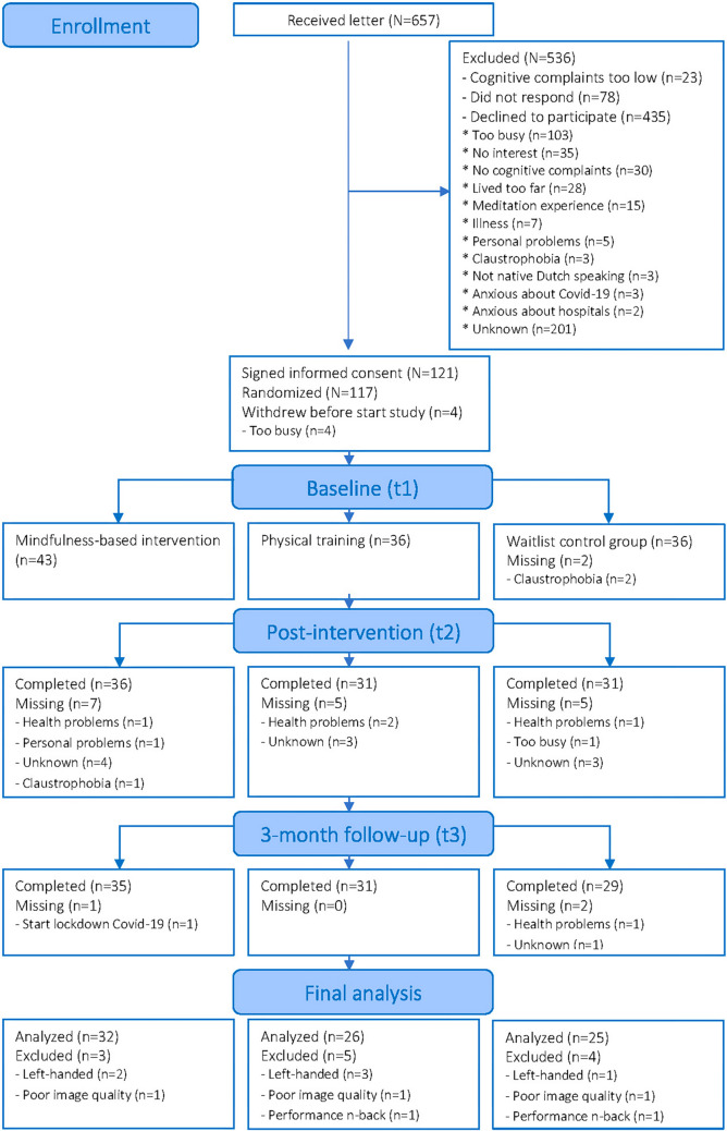 Results: Data of 83 participants (32/26/25 MBI/PT/WL) was included. Compared to the waitlist group, MBI participants showed reduced task-related activation in the right middle frontal and angular gyrus and increased activation in the right dorsal posterior cingulate cortex over time. Compared to the physical training group, MBI participants showed reduced brain activation in the bilateral superior parietal lobule and right dorsal anterior cingulate cortex over time. No differences between physical training and no intervention were identified.