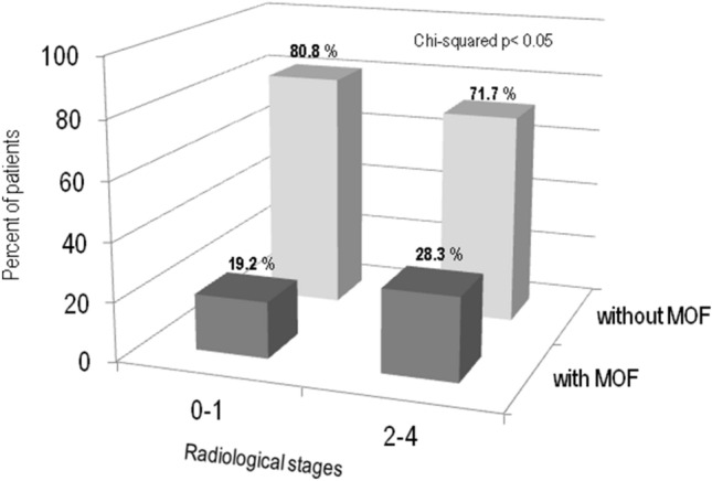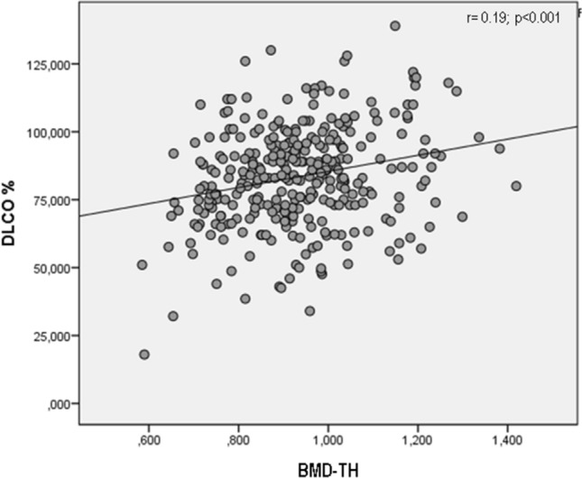 Results: Ninety patients (23.6%) with sarcoidosis have history of a MOF. BMD T-scores were lower in sarcoidosis with MOF with respect to those without MOF, but the difference was statistically significant only for BMD at femoral neck (p < 0.05). Moreover, BMD values at total hip was positively correlated with DLCO (%) (p < 0.001). Prevalence of MOF was higher in patients with sarcoidosis with lung parenchymal involvement (radiological stages 2-4) than in patients with sarcoidosis in chest X-ray stages 0 and 1 (28.3 vs 19.2% respectively, p < 0.05). Moreover, multiple regression analyses showed that X-ray Scadding score was positively associated with MOF.