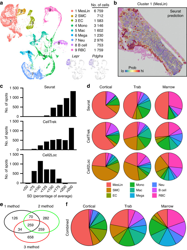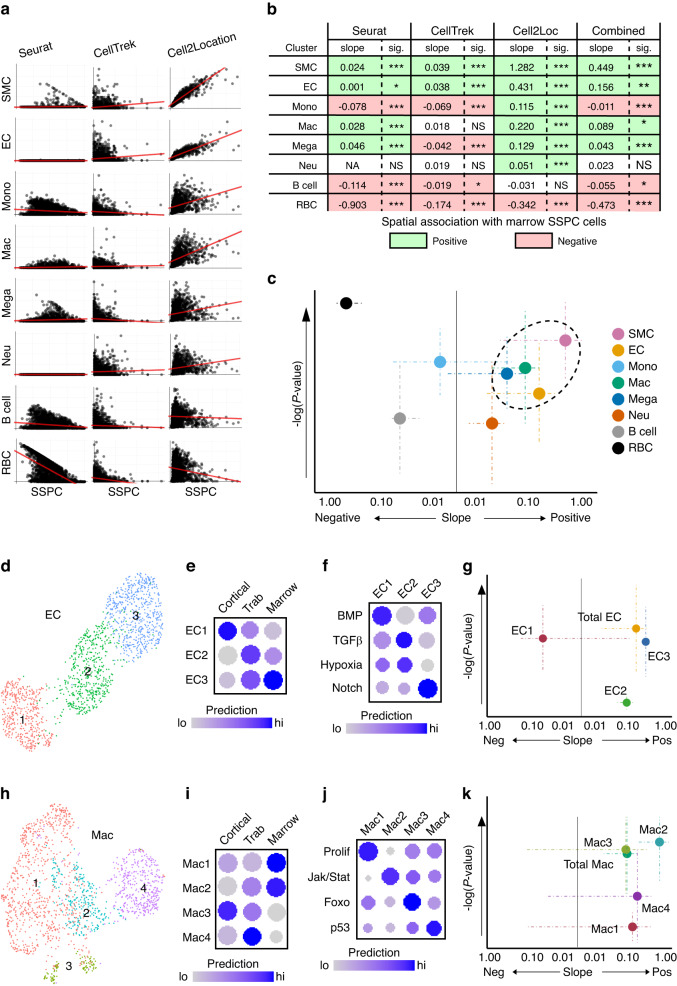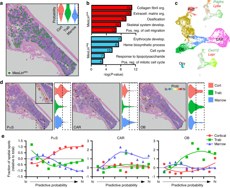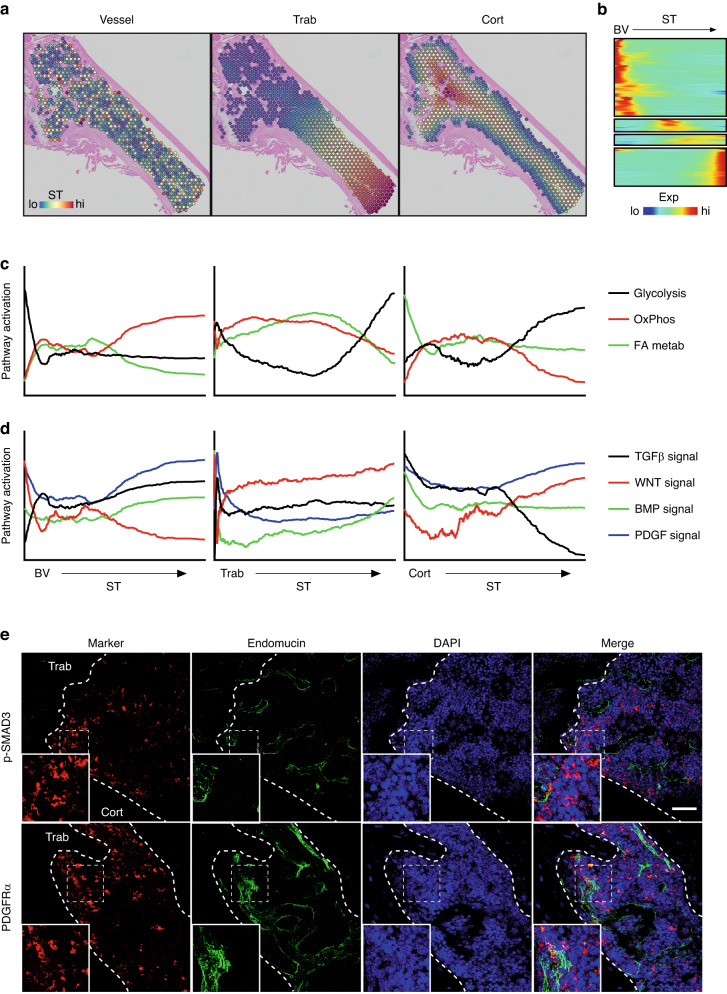 Self-renewal and differentiation of skeletal stem and progenitor cells (SSPCs) are tightly regulated processes, with SSPC dysregulation leading to progressive bone disease. While the application of single-cell RNA sequencing (scRNAseq) to the bone field has led to major advancements in our understanding of SSPC heterogeneity, stem cells are tightly regulated by their neighboring cells which comprise the bone marrow niche. However, unbiased interrogation of these cells at the transcriptional level within their native niche environment has been challenging. Here, we combined spatial transcriptomics and scRNAseq using a predictive modeling pipeline derived from multiple deconvolution packages in adult mouse femurs to provide an endogenous, in vivo context of SSPCs within the niche. This combined approach localized SSPC subtypes to specific regions of the bone and identified cellular components and signaling networks utilized within the niche. Furthermore, the use of spatial transcriptomics allowed us to identify spatially restricted activation of metabolic and major morphogenetic signaling gradients derived from the vasculature and bone surfaces that establish microdomains within the marrow cavity. Overall, we demonstrate, for the first time, the feasibility of applying spatial transcriptomics to fully mineralized tissue and present a combined spatial and single-cell transcriptomic approach to define the cellular components of the stem cell niche, identify cell‒cell communication, and ultimately gain a comprehensive understanding of local and global SSPC regulatory networks within calcified tissue.