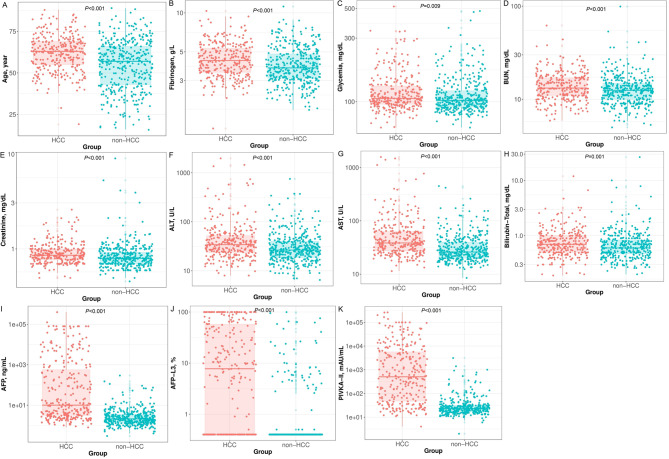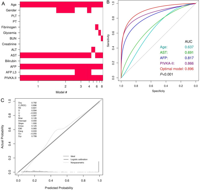 Results: A total of 681 newly-diagnosed primary liver disease subjects (385 non-HCC, 296 HCC) who tested negativity for the hepatitis B surface antigen (HBsAg) and hepatitis C antibody (anti-HCV) enrolled in this study. At the cut-off point of 3.8 ng/mL, AFP helps to discriminate HCC from non-HCC with an area under the curve (AUC) value of 0.817 (95% confidence interval [CI]: 0.785-0.849). These values of AFP-L3 (cut-off 0.9%) and PIVKA-II (cut-off 57.7 mAU/mL) were 0.758 (95%CI: 0.725-0.791) and 0.866 (95%CI: 0.836-0.896), respectively. The Bayesian Model Averaging (BMA) statistic identified the optimal model, including patients' age, aspartate aminotransferase, AFP, and PIVKA-II combination, which helps to classify HCC with better performance (AUC = 0.896, 95%CI: 0.872-0.920, P < 0.001). The sensitivity and specificity of the optimal model reached 81.1% (95%CI: 76.1-85.4) and 83.2% (95%CI: 78.9-86.9), respectively. Further analyses indicated that AFP and PIVKA-II markers and combined models have good-to-excellent performance detecting curative resected HCC, separating HCC from chronic hepatitis, dysplastic, and hyperplasia nodules.