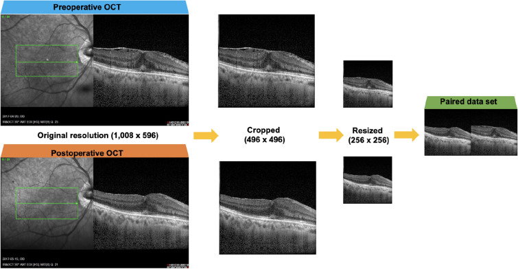To generate and evaluate synthesized postoperative OCT images of epiretinal membrane (ERM) based on preoperative OCT images using deep learning methodology. This study included a total 500 pairs of preoperative and postoperative optical coherence tomography (OCT) images for training a neural network. 60 preoperative OCT images were used to test the neural networks performance, and the corresponding postoperative OCT images were used to evaluate the synthesized images in terms of structural similarity index measure (SSIM). The SSIM was used to quantify how similar the synthesized postoperative OCT image was to the actual postoperative OCT image. The Pix2Pix GAN model was used to generate synthesized postoperative OCT images. Total 60 synthesized OCT images were generated with training values at 800 epochs. The mean SSIM of synthesized postoperative OCT to the actual postoperative OCT was 0.913. Pix2Pix GAN model has a possibility to generate predictive postoperative OCT images following ERM removal surgery.