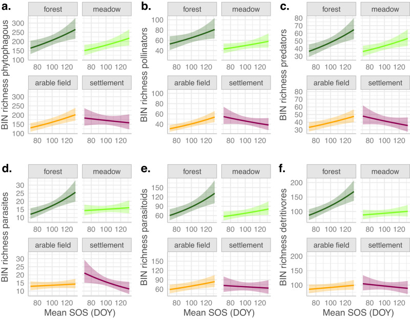 Urbanization and agricultural intensification are considered the main causes of recent insect decline in temperate Europe, while direct climate warming effects are still ambiguous. Nonetheless, higher temperatures advance spring leaf emergence, which in turn may directly or indirectly affect insects. We therefore investigated how Sentinel-2-derived start of season (SOS) and its spatial variability (SV-SOS) are affected by spring temperature and whether these green-up variables can explain insect biomass and richness across a climate and land-use gradient in southern Germany. We found that the effects of both spring green-up variables on insect biomass and richness differed between land-use types, but were strongest in forests. Here, insect richness and biomass were higher with later green-up (SOS) and higher SV-SOS. In turn, higher spring temperatures advanced SOS, while SV-SOS was lower at warmer sites. We conclude that with a warming climate, insect biomass and richness in forests may be affected negatively due to earlier and more uniform green-up. Promising adaptation strategies should therefore focus on spatial variability in green-up in forests, thus plant species and structural diversity.