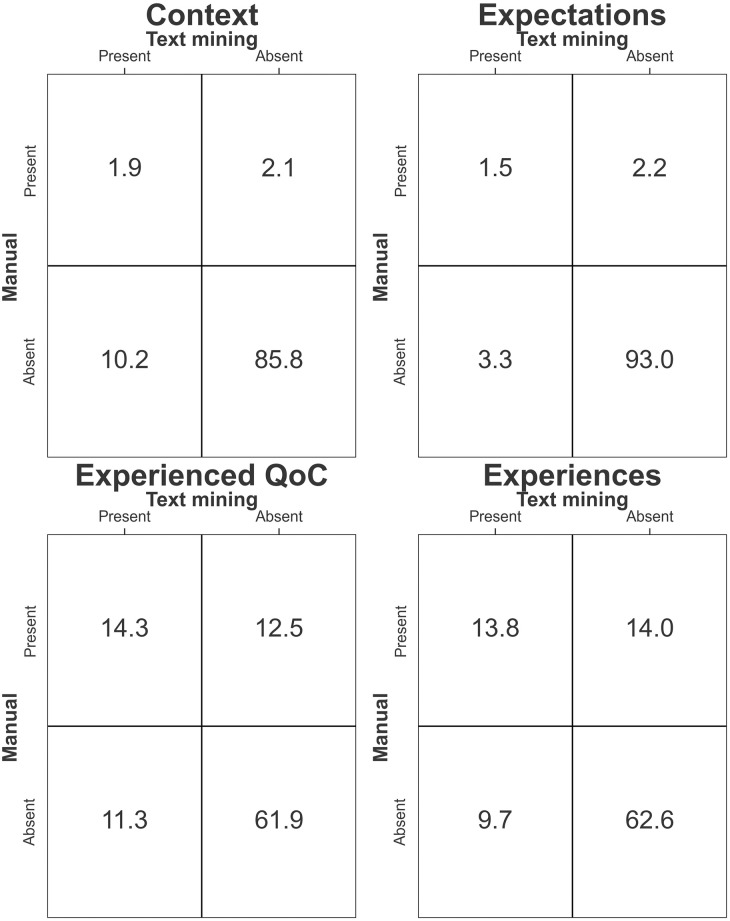 Methods: Data were collected from interviews with residents (n = 21), family members (n = 20), and care professionals (n = 20). Text mining models were developed and compared to the manual approach. The results of the manual and text mining approaches were evaluated based on three criteria: accuracy, consistency, and expert feedback. Accuracy assessed the similarity between the two approaches, while consistency determined whether each individual approach found the same themes in similar text segments. Expert feedback served as a representation of the perceived correctness of the text mining approach.