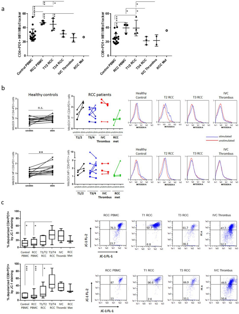 Renal cell carcinoma is an immunogenic tumour with a prominent dysfunctional immune cell infiltrate, unable to control tumour growth. Although tyrosine kinase inhibitors and immunotherapy have improved the outlook for some patients, many individuals are non-responders or relapse despite treatment. The hostile metabolic environment in RCC affects the ability of T-cells to maintain their own metabolic programme constraining T-cell immunity in RCC. We investigated the phenotype, function and metabolic capability of RCC TILs correlating this with clinicopathological features of the tumour and metabolic environment at the different disease stages. Flow cytometric analysis of freshly isolated TILs showed the emergence of exhausted T-cells in advanced disease based on their PD-1high and CD39 expression and reduced production of inflammatory cytokines upon in vitro stimulation. Exhausted T-cells from advanced stage disease also displayed an overall phenotype of metabolic insufficiency, characterized by mitochondrial alterations and defects in glucose uptake. Nanostring nCounter cancer metabolism assay on RNA obtained from 30 ccRCC cases revealed significant over-expression of metabolic genes even at early stage disease (pT1-2), while at pT3-4 and the locally advanced thrombi stages, there was an overall decrease in differentially expressed metabolic genes. Notably, the gene PPARGC1A was the most significantly down-regulated gene from pT1-2 to pT3-4 RCC which correlated with loss of mitochondrial function in tumour-infiltrating T-cells evident at this tumour stage. Down-regulation of PPARGC1A into stage pT3-4 may be the 'tipping-point' in RCC disease progression, modulating immune activity in ccRCC and potentially reducing the efficacy of immunotherapies in RCC and poorer patient outcomes.
