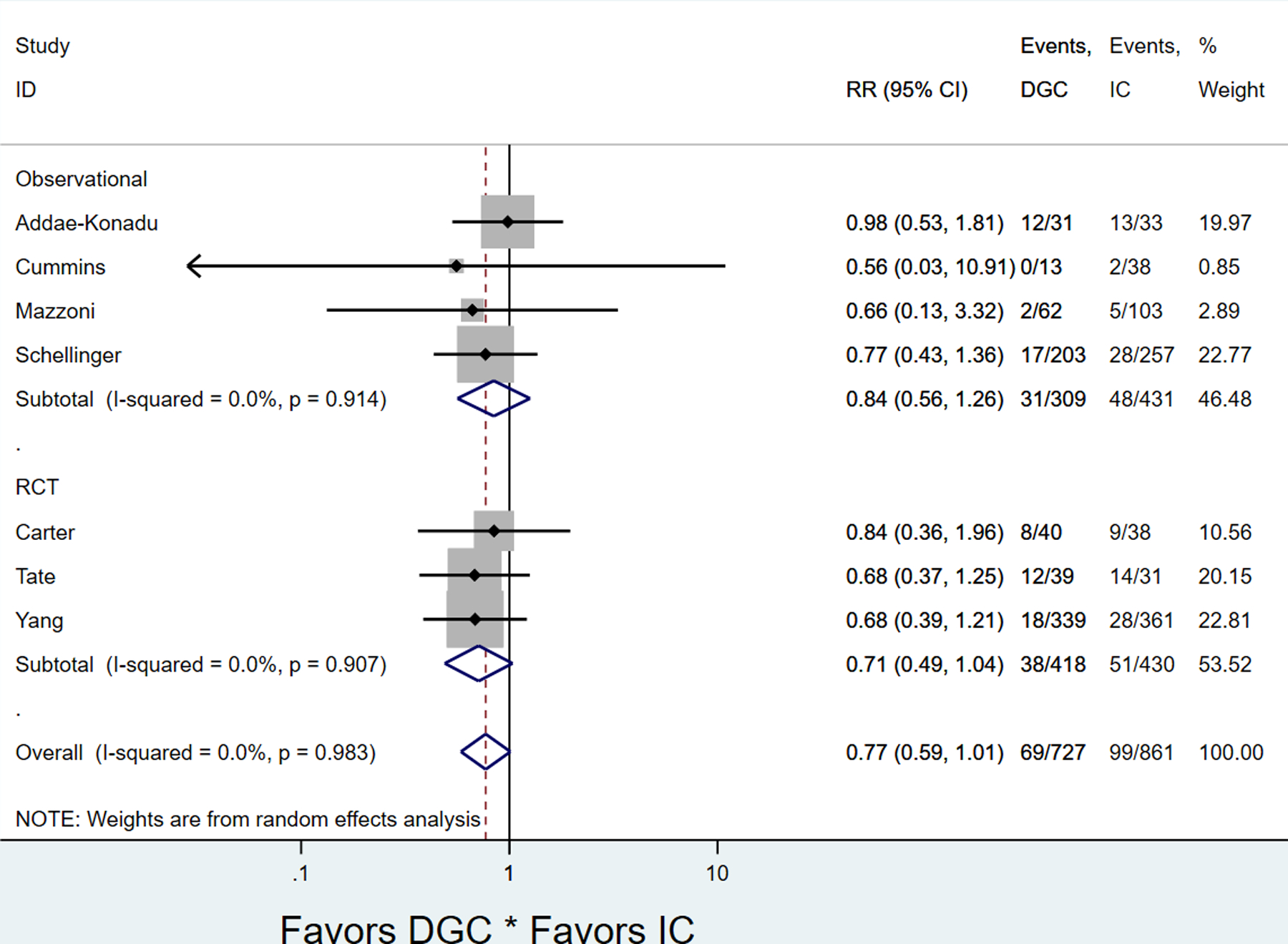 Tabulation, integration, and results: Eight studies met study criteria and were included in the final analysis: three RCTs and five observational studies. A total of 1,701 patients were included in the pooled studies: 770 (45.3%) in diabetes group prenatal care and 931 (54.7%) in individual care. Patients in diabetes group prenatal care had similar rates of preterm birth compared with patients in individual care (seven studies: pooled rates 9.5% diabetes group prenatal care vs 11.5% individual care, pooled RR 0.77, 95% CI, 0.59-1.01), which held for RCTs and observational studies. There was no difference between diabetes group prenatal care and individual care in rates of LGA overall (four studies: pooled rate 16.7% diabetes group prenatal care vs 20.2% individual care, pooled RR 0.93, 95% CI, 0.59-1.45) or by study type. Rates of other secondary outcomes were similar between diabetes group prenatal care and individual care, except patients in diabetes group prenatal care were more likely to receive postpartum LARC (three studies: pooled rates 46.1% diabetes group prenatal care vs 34.1% individual care, pooled RR 1.44, 95% CI, 1.09-1.91). When analysis was limited to patients with GDM, there were no differences in rates of A2GDM or postpartum visit attendance, but patients in diabetes group prenatal care were significantly more likely to complete postpartum OGTT (five studies: pooled rate 74.0% diabetes group prenatal care vs 49.4% individual care, pooled RR 1.58, 95% CI, 1.19-2.09).