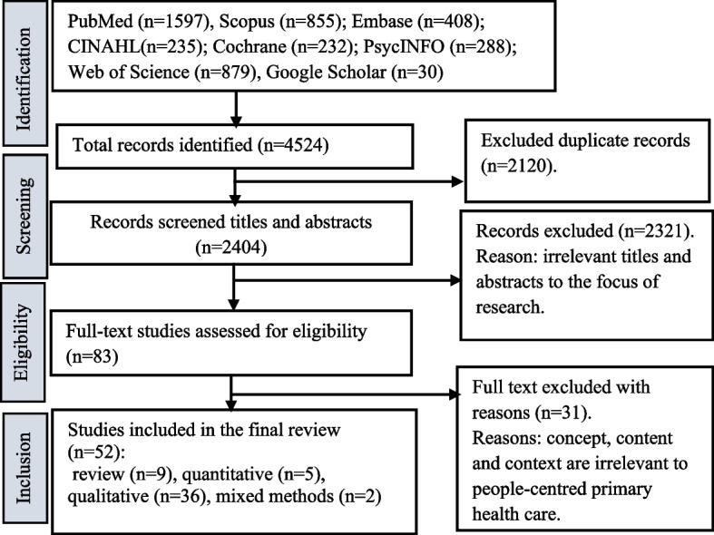 Methods: We conducted a scoping review of published literature on people-centred PHC. We searched eight databases (PubMed, Scopus, Embase, CINAHL, Cochrane, PsycINFO, Web of Science, and Google Scholar) using search terms related to people-centred and integrated PHC/primary care services. We followed the Preferred Reporting Items for Systematic Reviews and Meta-Analyses Extension for Scoping Reviews (PRISMA-ScR) checklist to select studies. We analyzed data and generated themes using Gale's framework thematic analysis method. Themes were explained under five components of the WHO IPCHS framework.