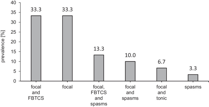 Results: Thirty-five patients aged 13.5 ± 7.8 years were included in the study. Diagnosis was confirmed genetically in 65.7% of patients (TSC1, 26.1%; TSC2, 65.2%; NMI, 8.7%). Mean age at diagnosis was 1.3 ± 3.5 years; 74.3% of the patients had been diagnosed within the first year of life due to seizures (62.9%) or/and cardiac rhabdomyomas (28.6%). The most common TSC manifestations included structural brain lesions (cortical tubers, 91.4%; subependymal nodules, 82.9%), epilepsy (85.7%), and cardiac rhabdomyomas (62.9%). Mean age at seizure onset was 1.5 ± 2.3 years, with onset in 80.0% of patients within the first two years of life. Infantile spasms, which were the first seizure type in 23.3% of the patients, developed earlier (0.6 ± 0.4 years) than focal seizures (1.8 ± 2.5 years). Refractory epilepsy was present in 21 (70.0%) patients, mild or severe intellectual impairment in 66.6%, and autism spectrum disorders in 11.4%. Severe cognitive impairment (33.3%) was significantly associated with epilepsy type and age at seizure onset (p < 0.05).