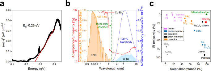 The combination of the ability to absorb most of the solar radiation and simultaneously suppress infrared re-radiation allows selective solar absorbers (SSAs) to maximize solar energy to heat conversion, which is critical to several advanced applications. The intrinsic spectral selective materials are rare in nature and only a few demonstrated complete solar absorption. Typically, intrinsic materials exhibit high performances when integrated into complex multilayered solar absorber systems due to their limited spectral selectivity and solar absorption. In this study, we propose CoSbx (2 < x < 3) as a new exceptionally efficient SSA. Here we demonstrate that the low bandgap nature of CoSbx endows broadband solar absorption (0.96) over the solar spectral range and simultaneous low emissivity (0.18) in the mid-infrared region, resulting in a remarkable intrinsic spectral solar selectivity of 5.3. Under 1 sun illumination, the heat concentrates on the surface of the CoSbx thin film, and an impressive temperature of 101.7 °C is reached, demonstrating the highest value among reported intrinsic SSAs. Furthermore, the CoSbx was tested for solar water evaporation achieving an evaporation rate of 1.4 kg m-2 h-1. This study could expand the use of narrow bandgap semiconductors as efficient intrinsic SSAs with high surface temperatures in solar applications.