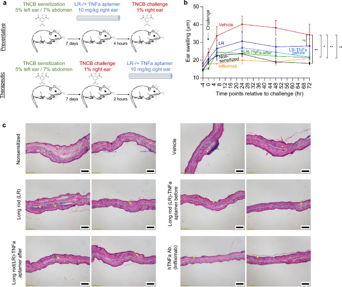 Spatial control over the distribution of therapeutics is a highly desired feature, which could limit the side effects of many drugs. Here we describe a nanoscale agent, fabricated from a coupled polymer-DNA origami hybrid that exhibits stability in serum and slow diffusion through tissues, in a manner correlating with shape and aspect ratio. Coupling to fragments of polyethylene glycol (PEG) through polyamine electrostatic interactions resulted in marked stability of the agents in-vivo, with > 90% of the agents maintaining structural integrity 5 days following subcutaneous injection. An agent functionalized with aptamers specific for human tumor necrosis factor TNF-alpha, significantly abrogated the inflammatory response in a delayed-type hypersensitivity model in humanized TNF-alpha mice. These findings highlight polymer-DNA hybrid nanostructures as a programmable and pharmacologically viable update to mainstream technologies such as monoclonal antibodies, capable of exerting an additional layer of control across the spatial dimension of drug activity.