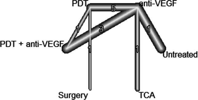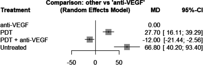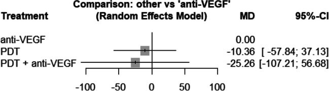 Results: We included 34 studies (2,098 eyes) in our network meta-analysis. In the early phase, the use of anti-VEGF led to a gain of 14.1 letters (95% CI, 10.8-17.4) compared to untreated patients (p < 0.0001), 12.1 letters (95% CI, 8.3-15.8) to photodynamic therapy (PDT) (p < 0.0001), 7.5 (95% CI, 1.2-13.8) letters to intravitreal triamcinolone acetonide (TCA) (p = 0.019), and - 2.9 letters (95% CI, - 6.0-0.2) to the combination of anti-VEGF and PDT (p = 0.065). In the later phase, these results were largely maintained. There were no significant differences in visual outcomes between patients treated with 1 + PRN and 3 + PRN. However, the 1 + PRN group received 1.8 (SD 1.3), while the 3 + PRN group received 3.2 (SD 0.9) injections within 12 months (p < 0.0001).