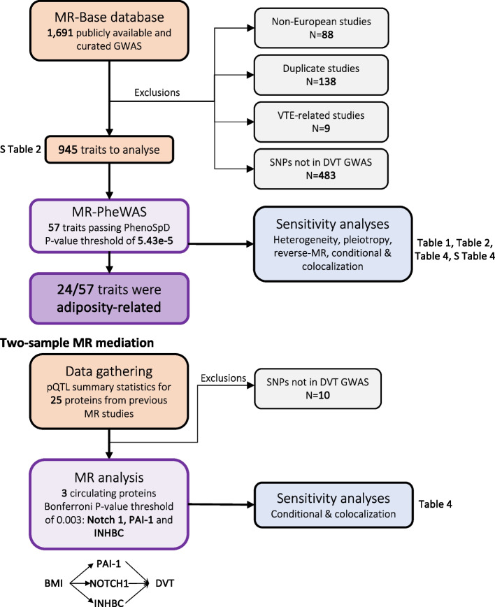 Deep vein thrombosis (DVT) is the formation of a blood clot in a deep vein. DVT can lead to a venous thromboembolism (VTE), the combined term for DVT and pulmonary embolism, a leading cause of death and disability worldwide. Despite the prevalence and associated morbidity of DVT, the underlying causes are not well understood. Our aim was to leverage publicly available genetic summary association statistics to identify causal risk factors for DVT. We conducted a Mendelian randomization phenome-wide association study (MR-PheWAS) using genetic summary association statistics for 973 exposures and DVT (6,767 cases and 330,392 controls in UK Biobank). There was evidence for a causal effect of 57 exposures on DVT risk, including previously reported risk factors (e.g. body mass index-BMI and height) and novel risk factors (e.g. hyperthyroidism and varicose veins). As the majority of identified risk factors were adiposity-related, we explored the molecular link with DVT by undertaking a two-sample MR mediation analysis of BMI-associated circulating proteins on DVT risk. Our results indicate that circulating neurogenic locus notch homolog protein 1 (NOTCH1), inhibin beta C chain (INHBC) and plasminogen activator inhibitor 1 (PAI-1) influence DVT risk, with PAI-1 mediating the BMI-DVT relationship. Using a phenome-wide approach, we provide putative causal evidence that hyperthyroidism, varicose veins and BMI enhance the risk of DVT. Furthermore, the circulating protein PAI-1 has a causal role in DVT aetiology and is involved in mediating the BMI-DVT relationship.