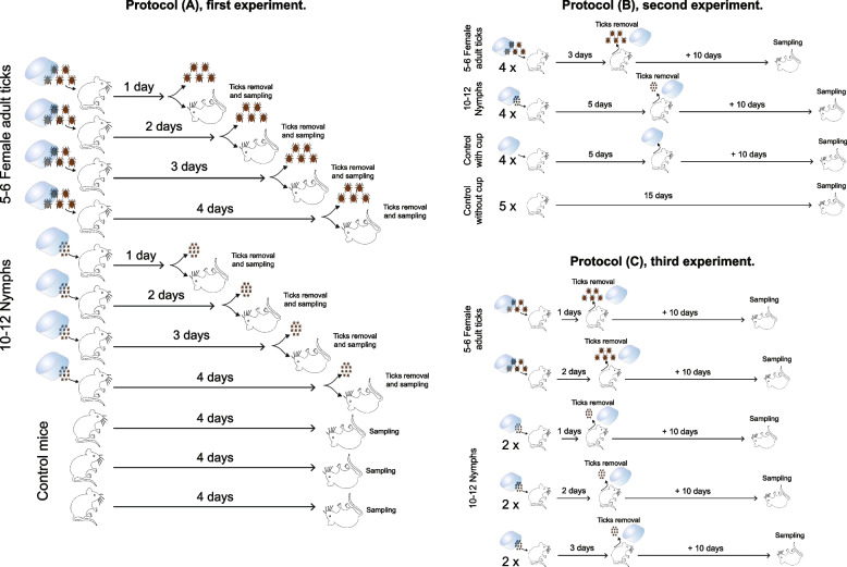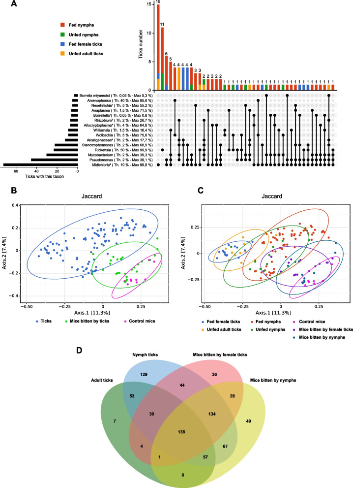 Methods: We used mice bitten by field-collected ticks (nymphs and adult ticks) in different experimental conditions to investigate, by 16S rRNA gene metabarcoding, the impact of blood feeding on both the mouse skin microbiome and the tick microbiome. We also investigated by PCR and 16S rRNA gene metabarcoding, the diversity of microorganisms transmitted to the host during the process of tick bite at the skin interface and the dissemination of the pathogen in host tissues (blood, heart, and spleen).