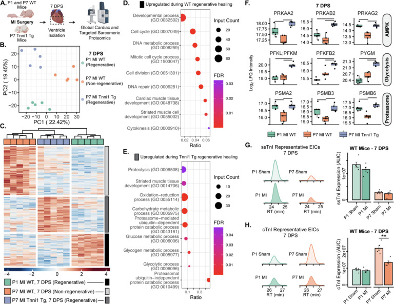 Adult mammalian cardiomyocytes have limited proliferative potential, and after myocardial infarction (MI), injured cardiac tissue is replaced with fibrotic scar rather than with functioning myocardium. In contrast, the neonatal mouse heart possesses a regenerative capacity governed by cardiomyocyte proliferation; however, a metabolic switch from glycolysis to fatty acid oxidation during postnatal development results in loss of this regenerative capacity. Interestingly, a sarcomere isoform switch also takes place during postnatal development where slow skeletal troponin I (ssTnI) is replaced with cardiac troponin I (cTnI). In this study, we first employ integrated quantitative bottom-up and top-down proteomics to comprehensively define the proteomic and sarcomeric landscape during postnatal heart maturation. Utilizing a cardiomyocyte-specific ssTnI transgenic mouse model, we found that ssTnI overexpression increased cardiomyocyte proliferation and the cardiac regenerative capacity of the postnatal heart following MI compared to control mice by histological analysis. Our global proteomic analysis of ssTnI transgenic mice following MI reveals that ssTnI overexpression induces a significant shift in the cardiac proteomic landscape. This shift is characterized by an upregulation of key proteins involved in glycolytic metabolism. Collectively, our data suggest that the postnatal TnI isoform switch may play a role in the metabolic shift from glycolysis to fatty acid oxidation during postnatal maturation. This underscores the significance of a sarcomere-metabolism axis during cardiomyocyte proliferation and heart regeneration.