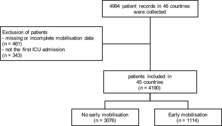 Results: Mobilisation data from 4190 patients from 280 ICUs in 45 countries were analysed. 1114 (26.6%) of these patients received mobilisation within 72 h after ICU admission; 3076 (73.4%) did not. In our analysis of factors associated with EM, mechanical ventilation at admission (OR 0.29; 95% CI 0.25, 0.35; p = 0.001), higher age (OR 0.99; 95% CI 0.98, 1.00; p ≤ 0.001), pre-existing asthma (OR 0.84; 95% CI 0.73, 0.98; p = 0.028), and pre-existing kidney disease (OR 0.84; 95% CI 0.71, 0.99; p = 0.036) were negatively associated with the initiation of EM. EM was associated with a higher chance of being discharged home (OR 1.31; 95% CI 1.08, 1.58; p = 0.007) but was not associated with length of stay in ICU (adj. difference 0.91 days; 95% CI - 0.47, 1.37, p = 0.34) and hospital (adj. difference 1.4 days; 95% CI - 0.62, 2.35, p = 0.24) or mortality (OR 0.88; 95% CI 0.7, 1.09, p = 0.24) when adjusted for covariates.