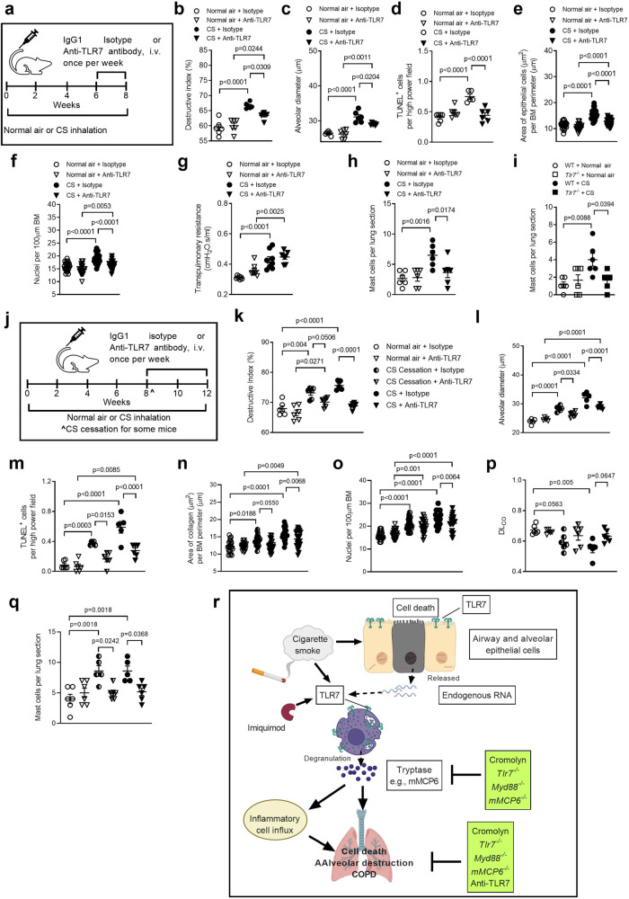 a Wild-type (WT) BALB/c mice (female, 6–8 weeks old) were exposed to normal air or CS for 8 weeks and treated with neutralizing anti-TLR7 monoclonal antibody or isotype control, intravenously (i.v.) once per week for 2 weeks, from weeks 6–8. b Quantification of destructive index (n = 6 mice per group) in lungs of isotype- or anti-TLR7-treated WT mice exposed to normal air or CS for 8 weeks. c Quantification of mean linear intercept (n = 6 mice per group) of isotype or anti-TLR7 -treated WT mice exposed to normal air or CS for 8 weeks. d Quantification of apoptotic cells (n = 6 mice per group) in TUNEL-stained lung sections from isotype or anti-TLR7 treated WT mice exposed to normal air or CS for 8 weeks. Quantification of e small airway epithelial cell area per µm of basement membrane (BM) perimeter and f nuclei numbers per 100 µm of BM perimeter of isotype- or anti-TLR7-treated WT mice exposed to normal air or CS for 8 weeks (4 small airways per mouse, n = 6 mice per group). g Transpulmonary resistance of isotype- or anti-TLR7-treated WT mice exposed to normal air or CS for 8 weeks (n = 6 mice per group). h Quantification of mast cells in lung sections from isotype- or anti-TLR7-treated WT mice exposed to normal air or CS for 8 weeks (n = 6 mice per group). i Quantification of mast cells in lung sections from WT and Tlr7−/− mice exposed to normal air or CS for 8 weeks (n = 6 mice per group). j WT BALB/c mice (female, 6–8 weeks old) were exposed to normal air or CS for 12 weeks and treated with neutralizing anti-TLR7 monoclonal antibody or isotype control, i.v. once per week, from weeks 8–12 (for 4 weeks). Some mice had CS cessation others continued CS exposure after 8 weeks prior to anti-TLR7 treatment. k Quantification of destructive index, l mean linear intercept and m apoptotic cells (n = 6 mice per group) in lungs of isotype- or anti-TLR7-treated WT mice exposed to normal air or CS with CS cessation or continued CS exposure from 8–12 weeks. Quantification of n small airway epithelial cell area per µm of basement membrane (BM) perimeter and o nuclei numbers per 100 µm of BM perimeter of isotype- or anti-TLR7-treated WT mice exposed to normal air or CS with CS cessation or continued CS exposure from 8–12 weeks (4 small airways per mouse, n = 6 mice per group). p Measurement of diffusing lung capacity for carbon monoxide (DLCO) of isotype- or anti-TLR7-treated WT mice exposed to normal air or CS with CS cessation or continued CS exposure from 8–12 weeks (n = 6 mice per group). q Quantification of mast cells in lung sections from isotype- or anti-TLR7-treated WT mice exposed to normal air or CS with CS cessation or continued CS exposure from 8–12 weeks (n = 6 mice per group). r Schematic representation of proposed mechanisms of how TLR7 contributes to CS-induced apoptosis and emphysema-like alveolar enlargement in experimental COPD in a mast cell-specific tryptase-dependent manner. All data are presented as means ± s.e.m. Statistical analysis was performed using one-way ANOVA with Bonferroni’s multiple comparison test. Source data are provided as a Source Data file.