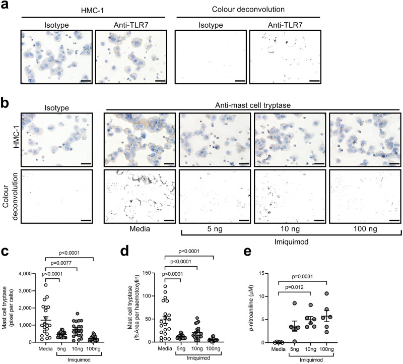 a Representative micrographs (top panels, n = 3) and color deconvolution of isotype control (left panels) and TLR7 (right panels) immunostaining of HMC-1 human mast cells. Scale bars, 50 µm. b Representative micrographs (top panels, n = 3) and color deconvolution (bottom panels) of isotype control (left panel) and mast cell tryptase (right panels) immunostaining of HMC-1 cells incubated with media or imiquimod (5, 10 or 100 ng) for 1 h, Scale bars, 50 µm. Quantification of mast cell tryptase in cells (10 random fields per sample, n = 3 per group) normalized to c number of cells or d area of hematoxylin of HMC-1 cells incubated with media or imiquimod (5, 10 or 100 ng) for 1 h. e Quantification of mast cell tryptase activity (n = 6 per group) in terms of p-nitroaniline levels in culture supernatants from HMC-1 cells incubated with media or imiquimod (5, 10, or 100 ng) for 1 h. Throughout, data are presented as means ± s.e.m. Statistical analysis was performed using one-way ANOVA with Bonferroni’s multiple comparison test. Source data are provided as a Source Data file.