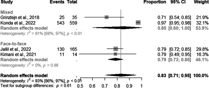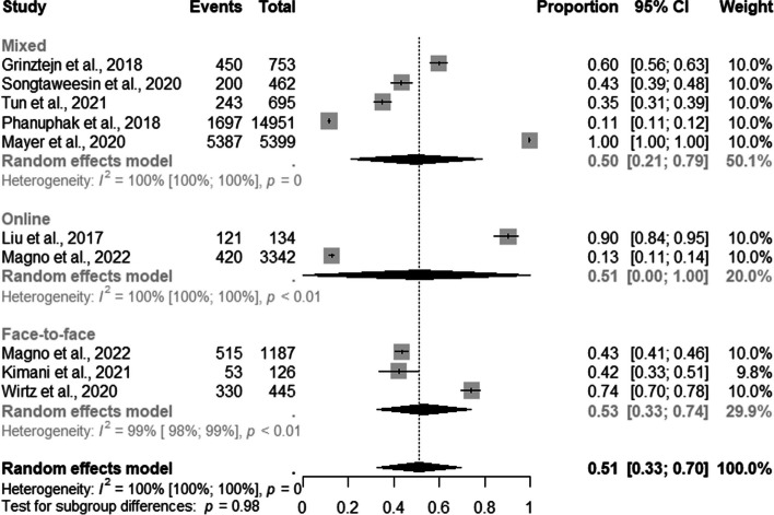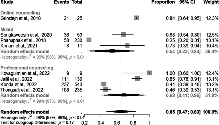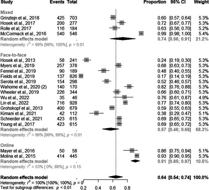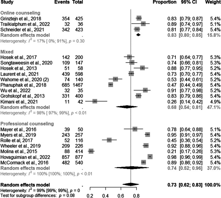 Results: A total of 1, 129 studies were retrieved from the five databases. After eligibility, 46 studies were included. For MSM, most DCS and RS were online at 91% (95% CI: 0.85-0.97; I2=53%), and 83% (95% CI: 0.80-0.85; I2=17%) respectively. For TGW, mixed DCS and RS were the most frequent at85% (95% CI: 0.60-1.00; I2=91%) and online counseling at 84% (95% CI: 0.64-0.95) compared to other strategies.