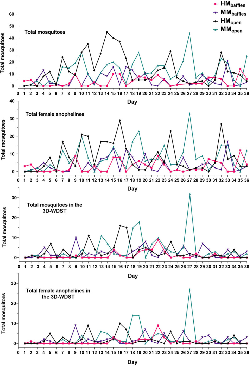 Results: Trial I showed that the 3D-WDST with two 3D-Screens used in huts with open eaves achieved the highest mosquito-capturing efficacy. This treatment captured 33.11% (CI 7.40-58.81) of female anophelines relative to the total collected in this hut (3D-WDST and room collections) and 27.27% (CI 4.23-50.31) of female anophelines relative to the total collected in the control hut (exit traps, room, and verandahs collections). In Trial II, the two 3D-Screens version of the 3D-WDST captured 70.32% (CI 56.87-83.77) and 51.07% (CI 21.72-80.41) of female anophelines in huts with and without baffles, respectively. Compared to the control hut, the capturing efficacy for female anophelines was 138.6% (37.23-239.9) and 42.41% (14.77-70.05) for huts with and without baffles, respectively. Trial III demonstrated similar performance between hand- and machine-made 3D structures.
