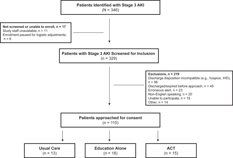 Results: In total, 46 of 110 eligible adults were enrolled. Education occurred in 18/18 and 14/15 participants in the Education and ACT groups, respectively. 30-day urine protein evaluation occurred in 15%, 28%, and 87% of the Usual Care, Education, and ACT groups, respectively (P < 0.001). Cumulative incidence of provider (primary care or nephrologist) and laboratory follow-up at 14 and 30 days was different across groups (14 days: Usual care 0%, Education 11%, ACT 73% [P < 0.01]; 30 days: 0%, 22%, and 73% [P < 0.01]). 30-day readmission rates were 23%, 44%, and 13% in the Usual Care, Education, and ACT groups, respectively (P = 0.13).