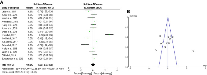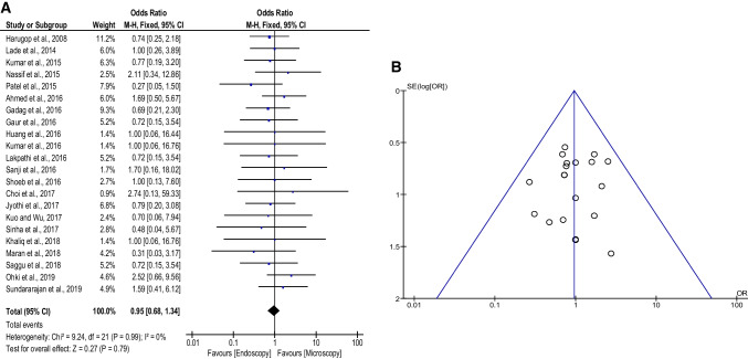Conclusions: Based on our meta-analysis, the surgical outcomes of endoscope-assisted and microscope-assisted type I tympanoplasty in terms of postoperative hearing outcomes and the graft uptake rate were comparable. On the contrary, operative time and complications rate proved to be significantly reduced with endoscopy compared to microscopy. Hence, the endoscope is as efficient as the microscope in type I tympanoplasty but less invasive, fewer in complications and shorter in operative time.