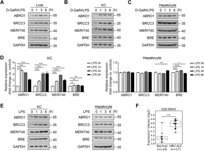 BRISC (BRCC3 isopeptidase complex) is a deubiquitinating enzyme that has been linked with inflammatory processes, but its role in liver diseases and the underlying mechanism are unknown. Here, we investigated the pathophysiological role of BRISC in acute liver failure using a mice model induced by D-galactosamine (D-GalN) plus lipopolysaccharide (LPS). We found that the expression of BRISC components was dramatically increased in kupffer cells (KCs) upon LPS treatment in vitro or by the injection of LPS in D-GalN-sensitized mice. D-GalN plus LPS-induced liver damage and mortality in global BRISC-null mice were markedly attenuated, which was accompanied by impaired hepatocyte death and hepatic inflammation response. Constantly, treatment with thiolutin, a potent BRISC inhibitor, remarkably alleviated D-GalN/LPS-induced liver injury in mice. By using bone marrow-reconstituted chimeric mice and cell-specific BRISC-deficient mice, we demonstrated that KCs are the key effector cells responsible for protection against D-GalN/LPS-induced liver injury in BRISC-deficient mice. Mechanistically, we found that hepatic and circulating levels of TNF-α, IL-6, MCP-1, and IL-1β, as well as TNF-α- and MCP-1-producing KCs, in BRISC-deleted mice were dramatically decreased as early as 1 h after D-GalN/LPS challenge, which occurred prior to the elevation of the liver injury markers. Moreover, LPS-induced proinflammatory cytokines production in KCs was significantly diminished by BRISC deficiency in vitro, which was accompanied by potently attenuated NF-κB activation. Restoration of NF-κB activation by two small molecular activators of NF-κB p65 effectively reversed the suppression of cytokines production in ABRO1-deficient KCs by LPS. In conclusion, BRISC is required for optimal activation of NF-κB-mediated proinflammatory cytokines production in LPS-treated KCs and contributes to acute liver injury. This study opens the possibility to develop new strategies for the inhibition of KCs-driven inflammation in liver diseases.