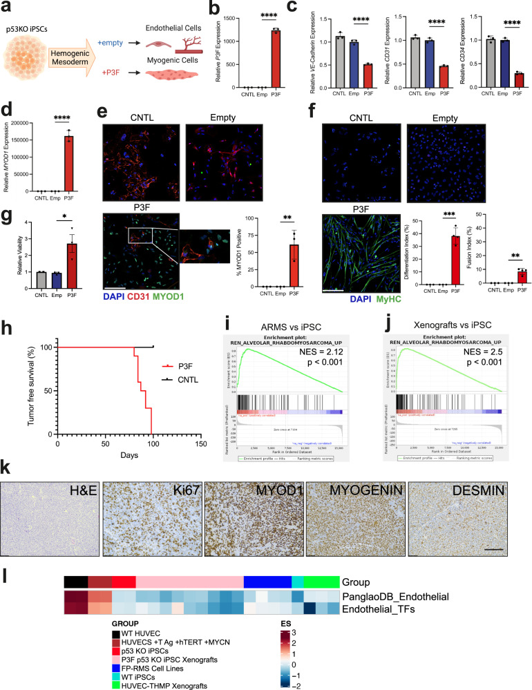 Fusion-positive rhabdomyosarcoma (FP-RMS) driven by the expression of the PAX3-FOXO1 (P3F) fusion oncoprotein is an aggressive subtype of pediatric rhabdomyosarcoma. FP-RMS histologically resembles developing muscle yet occurs throughout the body in areas devoid of skeletal muscle highlighting that FP-RMS is not derived from an exclusively myogenic cell of origin. Here we demonstrate that P3F reprograms mouse and human endothelial progenitors to FP-RMS. We show that P3F expression in aP2-Cre expressing cells reprograms endothelial progenitors to functional myogenic stem cells capable of regenerating injured muscle fibers. Further, we describe a FP-RMS mouse model driven by P3F expression and Cdkn2a loss in endothelial cells. Additionally, we show that P3F expression in TP53-null human iPSCs blocks endothelial-directed differentiation and guides cells to become myogenic cells that form FP-RMS tumors in immunocompromised mice. Together these findings demonstrate that FP-RMS can originate from aberrant development of non-myogenic cells driven by P3F.