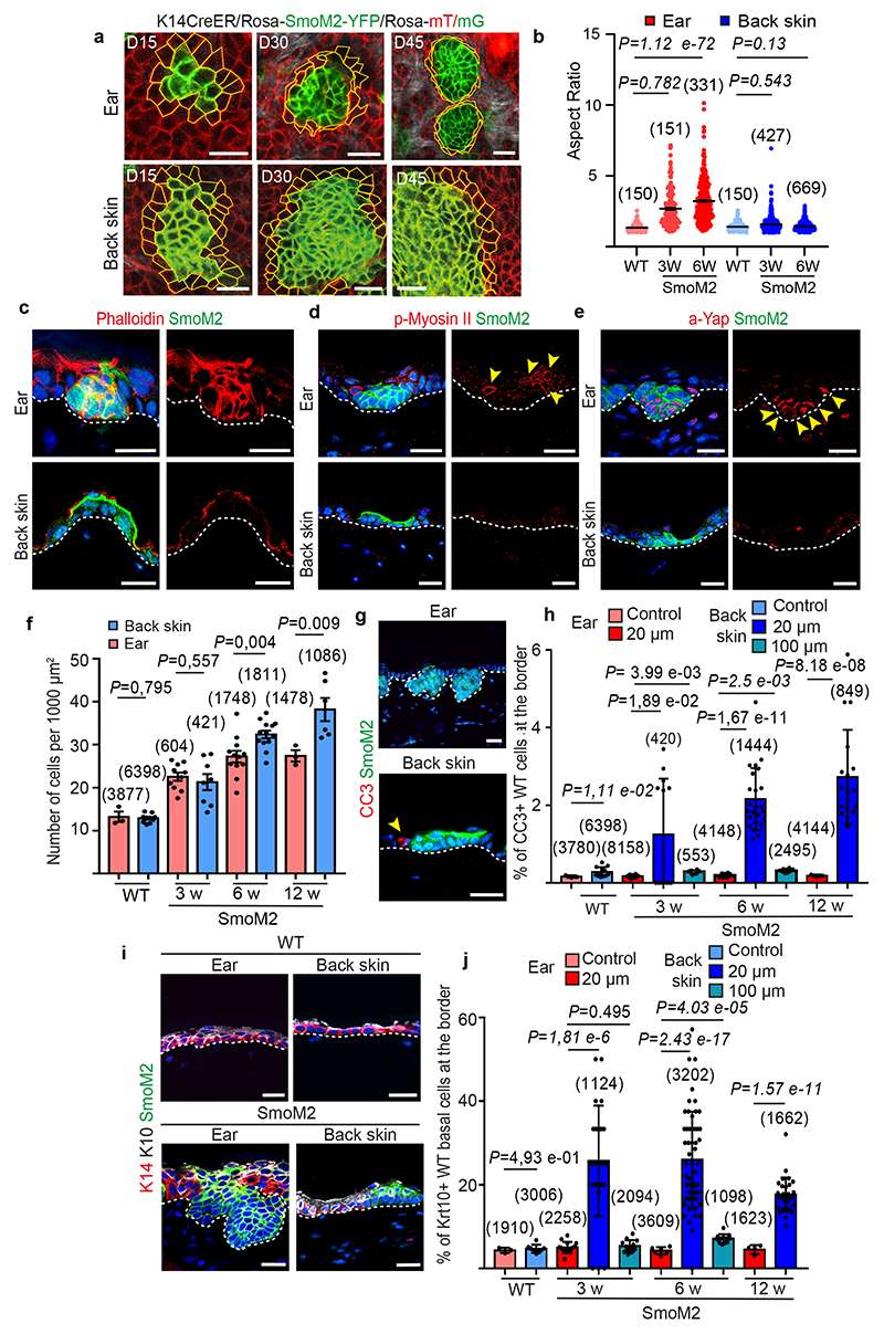 The skin epidermis is constantly renewed throughout life1,2. Disruption of the balance between renewal and differentiation can lead to uncontrolled growth and tumour initiation3. However, the ways in which oncogenic mutations affect the balance between renewal and differentiation and lead to clonal expansion, cell competition, tissue colonization and tumour development are unknown. Here, through multidisciplinary approaches that combine in vivo clonal analysis using intravital microscopy, single-cell analysis and functional analysis, we show how SmoM2-a constitutively active oncogenic mutant version of Smoothened (SMO) that induces the development of basal cell carcinoma-affects clonal competition and tumour initiation in real time. We found that expressing SmoM2 in the ear epidermis of mice induced clonal expansion together with tumour initiation and invasion. By contrast, expressing SmoM2 in the back-skin epidermis led to a clonal expansion that induced lateral cell competition without dermal invasion and tumour formation. Single-cell analysis showed that oncogene expression was associated with a cellular reprogramming of adult interfollicular cells into an embryonic hair follicle progenitor (EHFP) state in the ear but not in the back skin. Comparisons between the ear and the back skin revealed that the dermis has a very different composition in these two skin types, with increased stiffness and a denser collagen I network in the back skin. Decreasing the expression of collagen I in the back skin through treatment with collagenase, chronic UV exposure or natural ageing overcame the natural resistance of back-skin basal cells to undergoing EHFP reprogramming and tumour initiation after SmoM2 expression. Altogether, our study shows that the composition of the extracellular matrix regulates how susceptible different regions of the body are to tumour initiation and invasion.