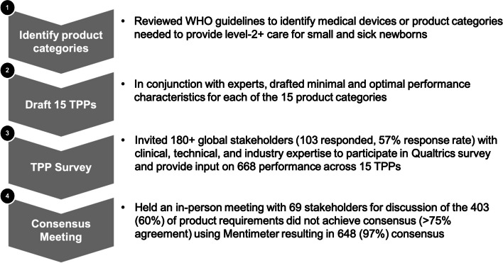 Methods: We developed initial TPPs for 15 newborn product categories for LMIC settings. A Delphi-like process was used to develop the TPPs. Respondents completed an online survey where they scored their level of agreement with each of the proposed performance characteristics for each of the 15 devices. Characteristics with < 75% agreement between respondents were discussed and voted on using Mentimeter™ at an in-person consensus meeting.