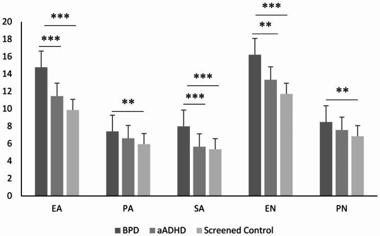 Conclusions: Our study confirmed the psychometric properties of the H-CTQ-SF, an easy-to-administer, non-invasive, ethically sound questionnaire. In aADHD patients without comorbid BPD, low levels of traumatization in every CTQ domain were comparable to those of healthy control individuals. Thus, the increased level of traumatization found in previous studies of aADHD might be associated with the presence of comorbid BPD. Our findings also support the role of emotional neglect, emotional abuse and sexual abuse in the development of BPD.