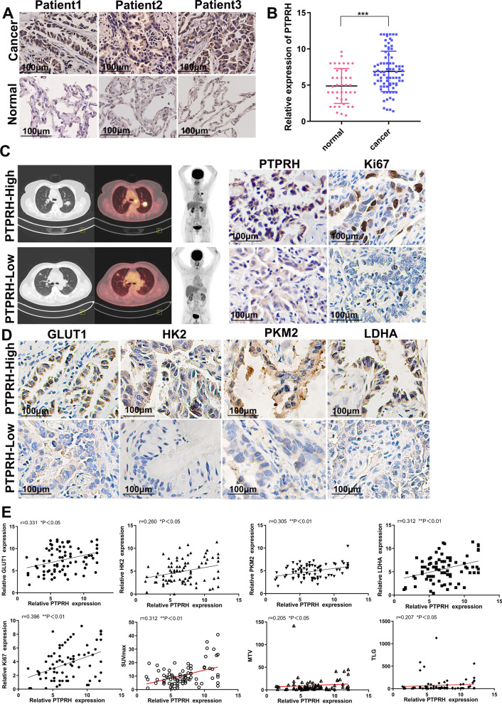 Results: The results showed that PTPRH was highly expressed in clinical patient tissue samples and closely related to tumor diameter and clinical stage. In addition, PTPRH expression was associated with glycometabolism indexes on 18F-FDG positron emission tomography/computed tomography (PET/CT) imaging, the expression level of Ki67 and the expression levels of glycolysis-related proteins. PTPRH altered cell behavior, inhibited apoptosis, and promoted 18F-FDG uptake, lactate production, and the expression of glycolysis-related proteins. In addition, PTPRH modulated the glycometabolism of NSCLC cells via the phosphatidylinositol-3-kinase (PI3K)/protein kinase B (AKT)/mammalian target of rapamycin (mTOR) signaling pathway, as assessed using LY294002 and 740Y-P (an inhibitor and agonist of PI3K, respectively). The same results were validated in vivo using a xenograft tumor model in nude mice. Protein expression levels of PTPRH, glycolysis-related proteins, p-PI3K/PI3K and p-AKT/AKT were measured by IHC staining using a subcutaneous xenograft model in nude mice.