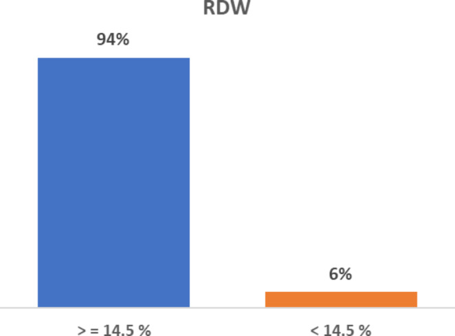 Results: 58% (58) of the patients included in the study had Hb less than 11.5 g/dl with an average Hb of 11 g/dl. 93% (93) had PCV < 40%, and 94% (94) had elevated RDW (> 14.5%). 53% of the patients included had low MCV, MCH, and MCHC. 53% of the patients showed features of microcytic hypochromic RBCs on the peripheral smear. Elevated RDW can be used as an indicator of an iron-deficient state in populations with a high prevalence of IDA, like India.