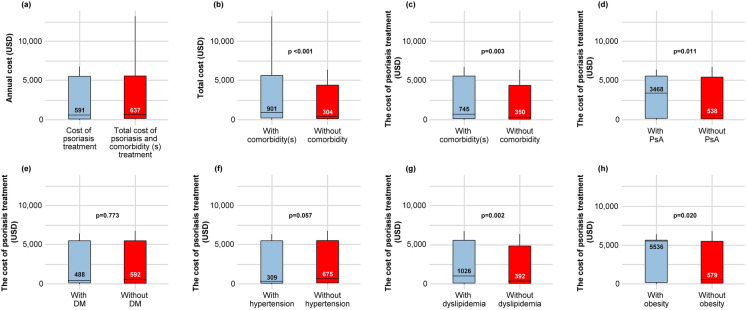 Results: A total of 661 patients were identified (mean ± standard deviation [SD] age 43.5 ± 14.8 years). The most prevalent comorbidity was dyslipidemia (49.6% of patients), followed by hypertension (23.4%), and psoriatic arthritis (10.4%). In total, 44% of patients received biologic therapies. Overall, 66.7% and 54.3% of patients receiving biologic and non-biologic therapies, respectively, had ≥ 1 comorbidity. Only 23.2% of patients with psoriasis-related comorbidities stopped therapy with biologics. Biologics had a longer retention time (17.0 months) than non-biologics (6.0 months) in patients with comorbidities. Patients with comorbidities had significantly higher total annual healthcare costs than those without comorbidities (in US dollars: USD901 vs. USD304; p < 0.001), mainly due to the relatively higher costs associated with the use of biologics.