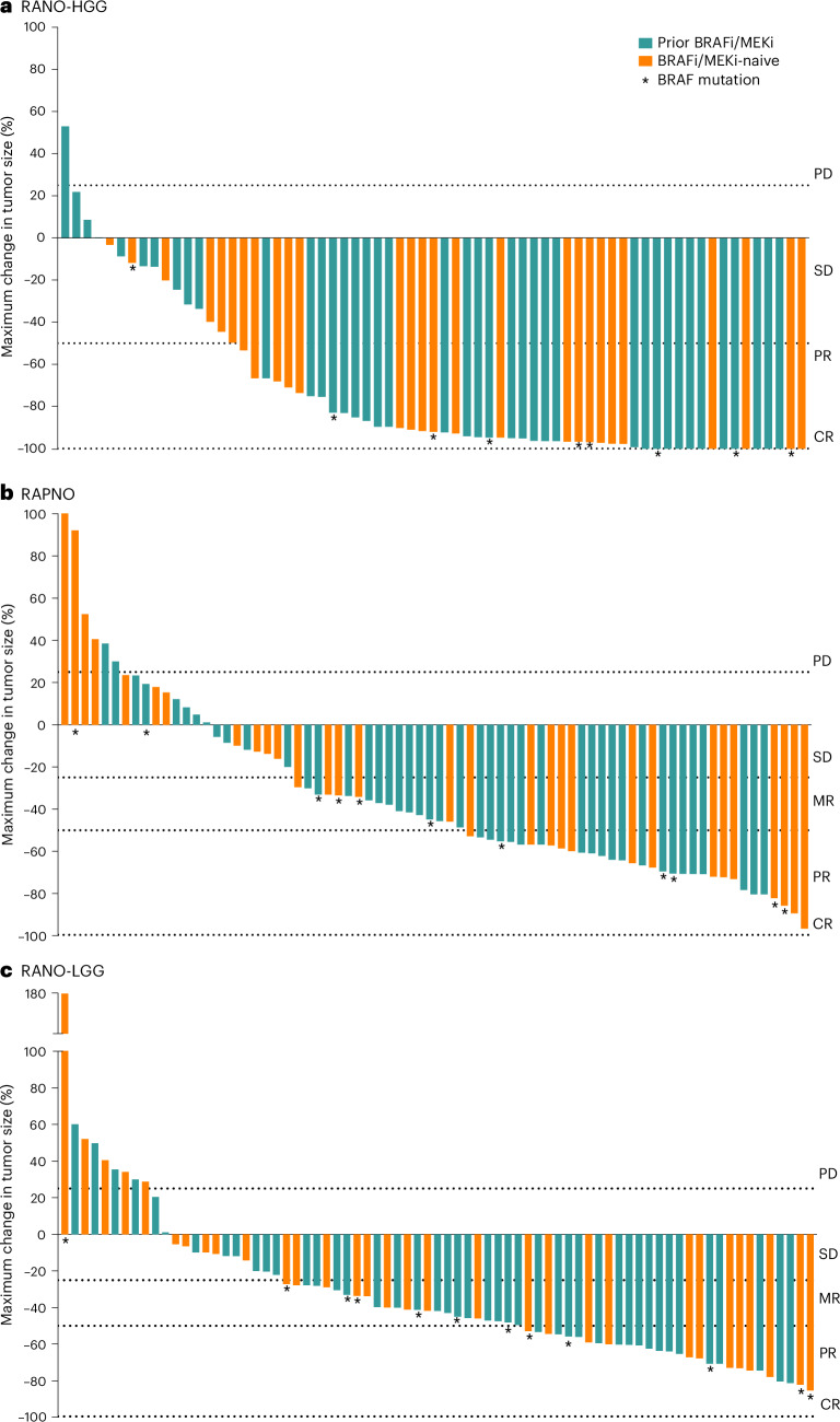 L.B.K. has received consulting fees from Blueprint Medicine as DSMB Chair and has contracted institutional research with Novartis, Regeneron Pharmaceuticals, Day One Biopharmaceuticals, Spring Works Therapeutics, Bristol Myers Squibb and SonALAsense. L.B.K. also owns stock in Onconova Therapeutics. J.R.H. has received honoraria for consultation from Bayer, Alexion Pharma and Boxer Capital. P.H.D. is on an advisory board with Alexion and is part of the Alexion ICI Sprinkle Study. S.P. is on advisory boards with Bayer, Alexion and Esai and has received research support from Novartis, Bayer and Roche. D.S.Z. has received consulting/advisory board fees from Bayer, AstraZeneca, Accendatech, Novartis, Day One Biopharmaceuticals, FivePhusion, Amgen, Alexion and Norgine and has received research support from Accendatech. O.W. is on advisory boards with Novartis, Janssen, Roche, Bristol Myers Squibb and AstraZeneca and has received research grants from Day One Biopharmaceuticals, Biomed Valley Discovery, Bristol Myers Squibb, Syndax and PreComb. H.J.K. is on advisory boards with Novartis, Jazz Pharmaceuticals, Takeda, Cartexell and GPCR. D.H. is on advisory boards with Alexion/AstraZeneca, Bayer, Bristol Myers Squibb, Celgene, Day One Biopharmaceuticals, Janssen, Novartis and Roche and has received research grants from Alexion/AstraZeneca and Roche. V.L. is on an advisory board with Alexion. C.K. is a study chair of an investigator-sponsored trial for which Day One Biopharmaceuticals provides drug and research support; she also has research relationships with other industry partners. D.S. is on an advisory board with Alexion. L.M., X.Z., A.W., D.D., P.M., I.C. and S.C.B. are employees of Day One Biopharmaceuticals and have received Day One Biopharmaceuticals stock and stock options. K.N. has received advisory board or consulting fees from Y-mAbs, EUSA Pharma, Bayer and Eli Lilly. All remaining authors declare no competing interests.