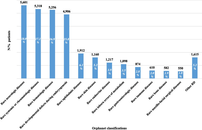 Results: During the study period, 3367 deaths occurred, mainly in males (53.9%), elderly patients (63.5%) and patients with diseases having a reported prevalence of 1-9/100000 (65.6%). When standardizing by age, the mortality ratio was higher in RD patients than in the general population, SMR = 1.93 (95% CI 1.84-2.11), with an observed gender difference, 2.01 (95% CI 1.88-2.29) in females and 1.86 (95% CI 1.73-2.10) in males. The lowest survival rates are experienced by patients with rare neurologic diseases, rare skin diseases and rare systemic or rheumatologic diseases, 58%, 68% and 81%, respectively, after a 15-year observation period. It should be noted that only 18% of patients diagnosed with motor neuron diseases were alive after 15 years from diagnosis.