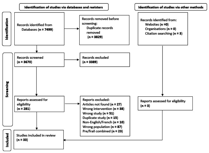 Results: Of 7499 articles, thirty met the criteria and three studies were identified in the references of included studies. Seventeen studies (56.7%) framed frailty as a reversible condition, with 11 studies (36.7%) selecting it as their primary outcome. Reversing frailty varied from either frail to pre-frail, frail to non-frail, and severe to mild frailty. We identified different types of single and multi-component interventions each targeting various domains of frailty. The physical domain was most frequently targeted (n = 32, 97%). Interventions also varied in their frequencies of delivery, intensities, and durations, and targeted participants from different settings, most commonly from community dwellings (n = 23; 69.7%).