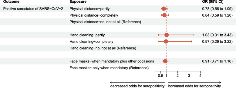 Results: Out of the 22,297 participants (median age: 54 years, 43% male), 781 were classified as SARS-CoV-2-infected and 3,877 had a vaccinated immune response. Vaccinated individuals were less likely to keep 1.5 m distance [OR = 0.74 (95% CI: 0.57-0.97)] and only partly physically distanced [OR = 0.71 (95% CI: 0.58-0.87)]. Participants with self-reported positive PCR test had a lower chance of adhering partly to physical distancing [OR = 0.70 (95% CI: 0.50-0.99)] in comparison to the reference group. Higher odds of additionally wearing a face mask was observed in vaccinated [OR = 1.28 (95% CI: 1.08-1.51)] even if it was not obligatory. Overall, among unvaccinated participants, we found little evidence of lower odds of seropositivity given mask wearing [OR: 0.91 (95% CI: 0.71-1.16)], physical distancing [OR: 0.84 (95% CI: 0.59-1.20)] and no evidence for completely adhering to hand cleaning [OR: 0.97 (95% CI: 0.29-3.22)].