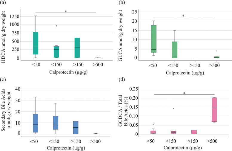 Results: IBD patients exhibited altered primary and secondary bile acid ratios in stool, with notable distinctions between ulcerative colitis (UC) compared to Crohn's disease (CD) and healthy controls. Fecal calprotectin was negatively correlated with glycolithocholic acid (GLCA) and hyodeoxycholic acid (HDCA) in UC. These bile acids were reduced in stool of UC patients with fecal calprotectin levels > 500 µg/g compared to UC patients with low calprotectin levels. Moreover, negative associations of six secondary bile acids with C-reactive protein (CRP) existed in UC. In CD patients, fecal bile acids did not correlate with CRP or fecal calprotectin. Diarrhoea is common in IBD, and UC patients with diarrhoea had reduced deoxycholic acid (DCA), glycine conjugated DCA (GDCA) and lithocholic acid in stool in contrast to patients with normal stool consistency. Fecal bile acid levels were not associated with diarrhoea in CD patients. UC patients treated with mesalazine had increased levels of fecal GDCA whereas no such changes were observed in CD patients. Bile acid levels of CD and UC patients treated with biologicals or corticosteroids did not change. Relative levels of GHDCA (specificity: 79%, sensitivity: 67%) and glycochenodeoxycholic acid (specificity: 74%, sensitivity: 63%) were the most specific to distinguish UC from CD.