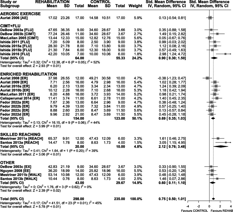 Few certainties exist regarding the optimal type, timing, or dosage of rehabilitation after stroke. Despite differing injury mechanisms and recovery patterns following ischemic and hemorrhagic stroke, most translational stroke research is conducted after ischemia. As we enter the era of personalized medicine, exploring subtype-specific treatment efficacy is essential to optimizing recovery. Our objective was to characterize common rehabilitation interventions used after in vivo preclinical intracerebral hemorrhage (ICH) and assess the impact of post-ICH rehabilitation (vs. no-rehabilitation) on recovery of motor function. Following PRISMA guidelines, a systematic review (Academic Search Complete, CINAHL, EMBASE, Medline, PubMed Central) identified eligible articles published up to December 2022. Risk of bias (SYRCLE) and study quality (CAMARADES) were evaluated, and random-effects meta-analysis was used to assess treatment efficacy in recovery of forelimb and locomotor functions. Thirty articles met inclusion criteria, and 48 rehabilitation intervention groups were identified. Most used collagenase to model striatal ICH in young, male rodents. Aerobic exercise, enriched rehabilitation, and constraint-induced movement therapy represented ~ 70% of interventions. Study quality was low (median 4/10, range 2-8), and risk of bias was unclear. Rehabilitation provided modest benefits in skilled reaching, spontaneous impaired forelimb use, and locomotor function; however, effects varied substantially by endpoint, treatment type, and study quality. Rehabilitation statistically improves motor function after preclinical ICH, but whether these effects are functionally meaningful is unclear. Incomplete reporting and variable research quality hinder our capacity to analyze and interpret how treatment factors influence rehabilitation efficacy and recovery after ICH.