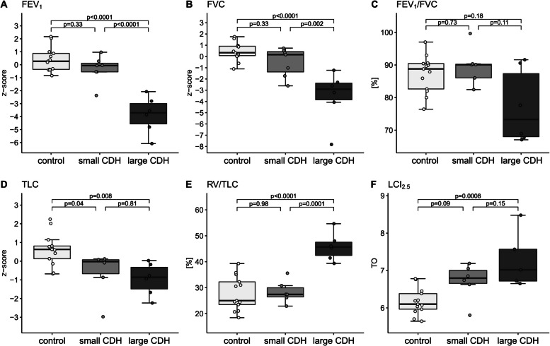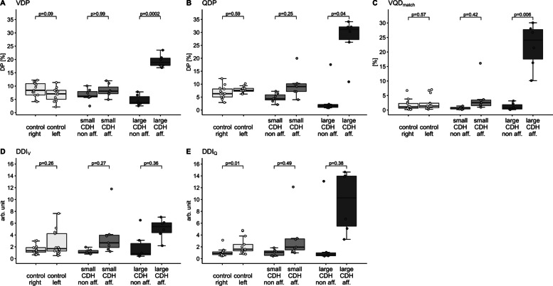 Results: Patients with a large CDH showed significantly reduced overall lung function compared to healthy controls (mean difference [95%-CIadjusted]: FEV1 (z-score) -4.26 [-5.61, -2.92], FVC (z-score) -3.97 [-5.68, -2.26], LCI2.5 (TO) 1.12 [0.47, 1.76], VDP (%) 8.59 [3.58, 13.60], QDP (%) 17.22 [13.16, 21.27]) and to patients with a small CDH. Side-specific examination by MP-MRI revealed particularly reduced ipsilateral ventilation and perfusion in patients with a large CDH (mean difference to contralateral side [95%-CIadjusted]: VDP (%) 14.80 [10.50, 19.00], QDP (%) 23.50 [1.75, 45.20]).