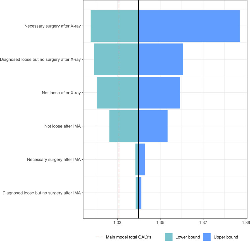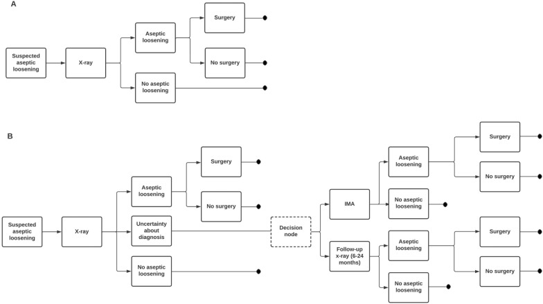 Objective: To investigate the cost-effectiveness of using Implant Movement Analysis (IMA) to follow up suspected aseptic loosening when the diagnosis after an initial X-ray is not conclusive, compared with a diagnostic pathway with X-ray follow-up.
