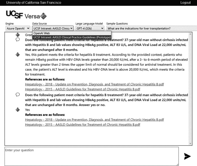 Methods: We developed "LiVersa," a liver disease-specific LLM, by using our institution's protected health information (PHI)-complaint text embedding and LLM platform, "Versa." We conducted RAG on 30 publicly available American Association for the Study of Liver Diseases (AASLD) guidelines and guidance documents to be incorporated into LiVersa. We evaluated LiVersa's performance by comparing its responses versus those of trainees from a previously published knowledge assessment study regarding hepatitis B (HBV) treatment and hepatocellular carcinoma (HCC) surveillance.