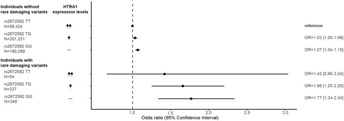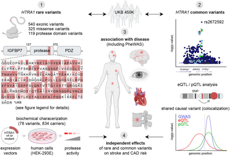 HTRA1 has emerged as a major risk gene for stroke and cerebral small vessel disease with both rare and common variants contributing to disease risk. However, the precise mechanisms mediating this risk remain largely unknown as does the full spectrum of phenotypes associated with genetic variation in HTRA1 in the general population. Using a family-history informed approach, we first show that rare variants in HTRA1 are linked to ischemic stroke in 425,338 European individuals from the UK Biobank with replication in 143,149 individuals from the Biobank Japan. Integrating data from biochemical experiments on 76 mutations occurring in the UK Biobank, we next show that rare variants causing loss of protease function in vitro associate with ischemic stroke, coronary artery disease, and skeletal traits. In addition, a common causal variant (rs2672592) modulating circulating HTRA1 mRNA and protein levels enhances the risk of ischemic stroke, small vessel stroke, and coronary artery disease while lowering the risk of migraine and age-related macular dystrophy in GWAS and UK Biobank data from > 2,000,000 individuals. There was no evidence of an interaction between genetically proxied HTRA1 activity and levels. Our findings demonstrate a central role of HTRA1 for human disease including stroke and coronary artery disease and identify two independent mechanisms that might qualify as targets for future therapeutic interventions.