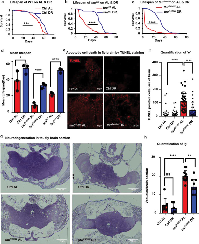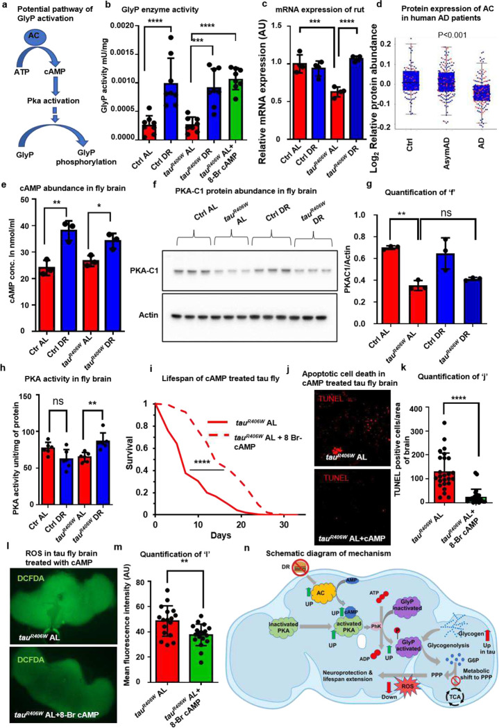 Tauopathies encompass a range of neurodegenerative disorders, such as Alzheimer's disease (AD) and frontotemporal dementia (FTD). Unfortunately, current treatment approaches for tauopathies have yielded limited success, underscoring the pressing need for novel therapeutic strategies. We observed distinct signatures of impaired glycogen metabolism in the Drosophila brain of the tauopathy model and the brain of AD patients, indicating a link between tauopathies and glycogen metabolism. We demonstrate that the breakdown of neuronal glycogen by activating glycogen phosphorylase (GlyP) ameliorates the tauopathy phenotypes in flies and induced pluripotent stem cell (iPSC) derived neurons from FTD patients. We observed that glycogen breakdown redirects the glucose flux to the pentose phosphate pathway to alleviate oxidative stress. Our findings uncover a critical role for increased GlyP activity in mediating the neuroprotection benefit of dietary restriction (DR) through the cAMP-mediated protein kinase A (PKA) activation. Our studies identify impaired glycogen metabolism as a key hallmark for tauopathies and offer a promising therapeutic target in tauopathy treatment.
