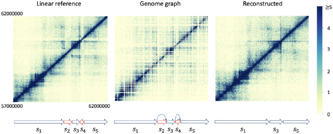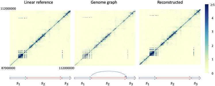 Three-dimensional chromosome structure plays an important role in fundamental genomic functions. Hi-C, a high-throughput, sequencing-based technique, has drastically expanded our comprehension of 3D chromosome structures. The first step of Hi-C analysis pipeline involves mapping sequencing reads from Hi-C to linear reference genomes. However, the linear reference genome does not incorporate genetic variation information, which can lead to incorrect read alignments, especially when analyzing samples with substantial genomic differences from the reference such as cancer samples. Using genome graphs as the reference facilitates more accurate mapping of reads, however, new algorithms are required for inferring linear genomes from Hi-C reads mapped on genome graphs and constructing corresponding Hi-C contact matrices, which is a prerequisite for the subsequent steps of the Hi-C analysis such as identifying topologically associated domains and calling chromatin loops. We introduce the problem of genome sequence inference from Hi-C data mediated by genome graphs. We formalize this problem, show the hardness of solving this problem, and introduce a novel heuristic algorithm specifically tailored to this problem. We provide a theoretical analysis to evaluate the efficacy of our algorithm. Finally, our empirical experiments indicate that the linear genomes inferred from our method lead to the creation of improved Hi-C contact matrices. These enhanced matrices show a reduction in erroneous patterns caused by structural variations and are more effective in accurately capturing the structures of topologically associated domains.