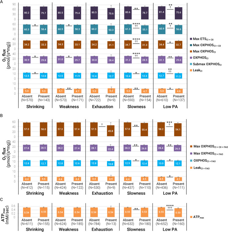 Results: One-SD decrements of most respirometry measures (e.g., Max OXPHOSCI+CII, adjusted POR = 1.5, 95%CI [1.2,1.8], p = 0.0001) were significantly associated with greater frailty classification. The associations of ATPmax with frailty were weaker than those between Max OXPHOSCI+CII and frailty. Muscle energetics was most strongly associated with slowness and low physical activity components.