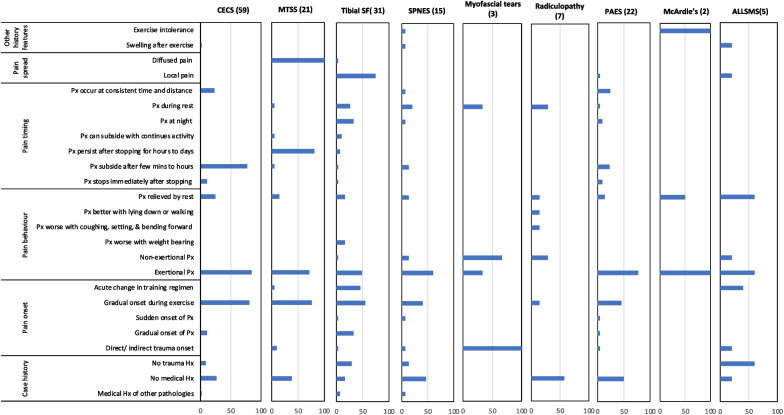 Results: One hundred nineteen retained manuscripts, of which 18 studied multiple conditions, had a median quality of 2/5. A combination of the history, pain location, symptoms, physical findings, and investigative modalities were fundamental to identify each sub-diagnosis alongside excluding differentials. The details differed markedly for each sub-diagnosis. Fifty-nine manuscripts included data on chronic exertional compartment syndrome (CECS) revealing exertional pain (83% history), dull aching pain (76% symptoms), absence of physical signs (78% physical findings) and elevated intercompartment pressure (93% investigative modality). Twenty-one manuscripts included data on medial tibial stress syndrome (MTSS), revealing persistent pain upon discontinuation of activity (81% history), diffuse medial tibial pain (100% pain location), dull ache (86% symptoms), diffuse tenderness (95% physical findings) and MRI for exclusion of differentials (62% investigative modality). Similar analyses were performed for stress fractures (SF, n = 31), popliteal artery entrapment syndrome (PAES, n = 22), superficial peroneal nerve entrapment syndrome (SPNES, n = 15), lumbar radiculopathy (n = 7), accessory/low-lying soleus muscle syndrome (ALLSMS, n = 5), myofascial tears (n = 3), and McArdle's syndrome (n = 2).